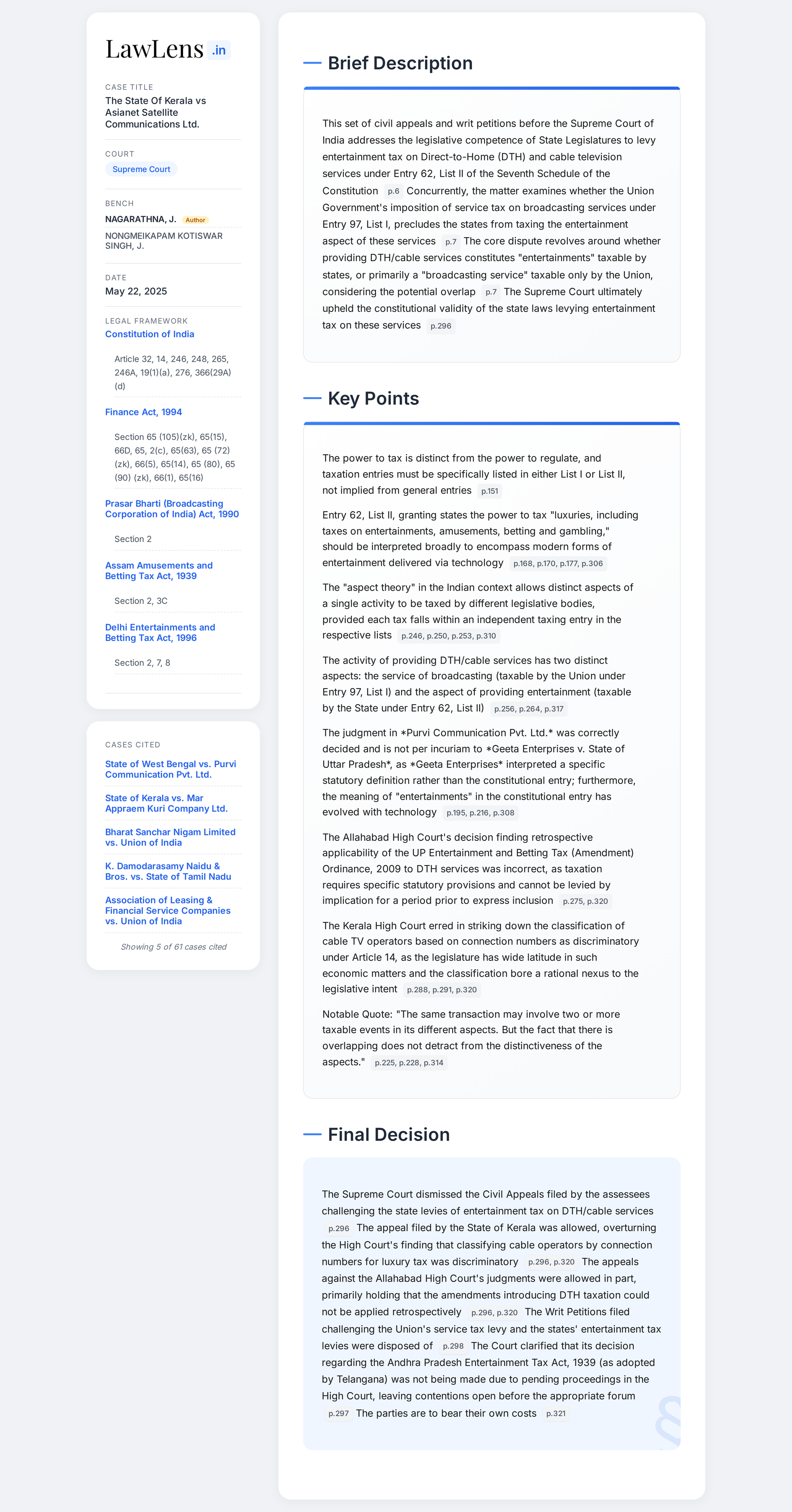 State Of Kerala vs Asianet Satellite Communications 2025 INSC 757 - Constitution - Taxation Powers - Entertainment Tax
