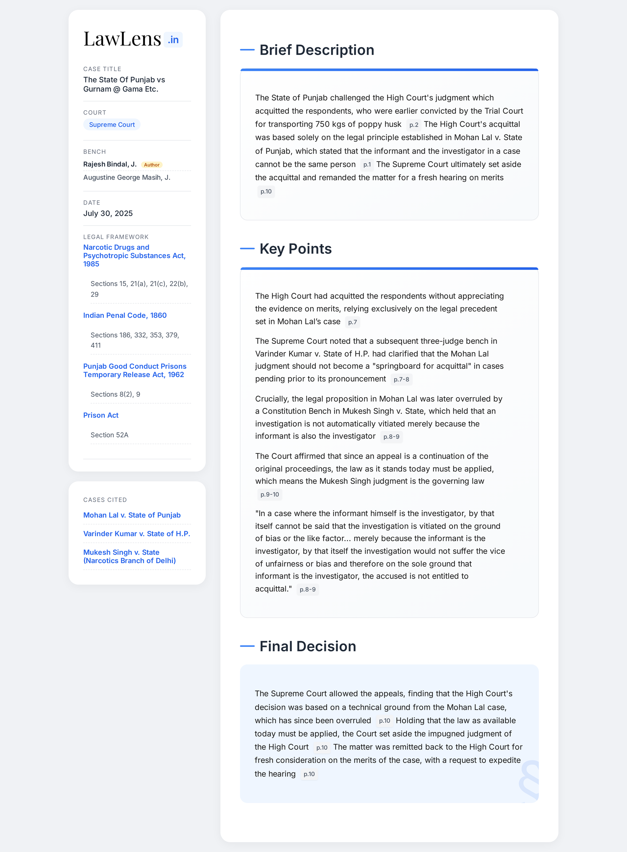 State of Punjab vs. Gurnam @ Gama 2025 INSC 960 - NDPS Act - Acquittal Relying On Mohan Lal's Case Set Aside
