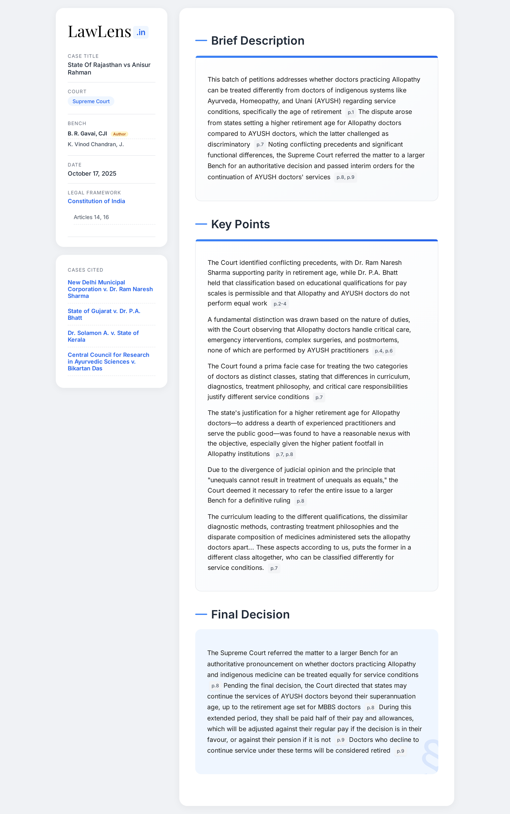 - State of Gujarat & Ors. v. Dr. P.A. Bhatt & Ors. — 2023 SCC OnLine SC 503.Distinguished Ram Naresh Sharma; upheld classification based on qualifications; denied equal pay parity to AYUSH vis‑à‑vis MBBS.