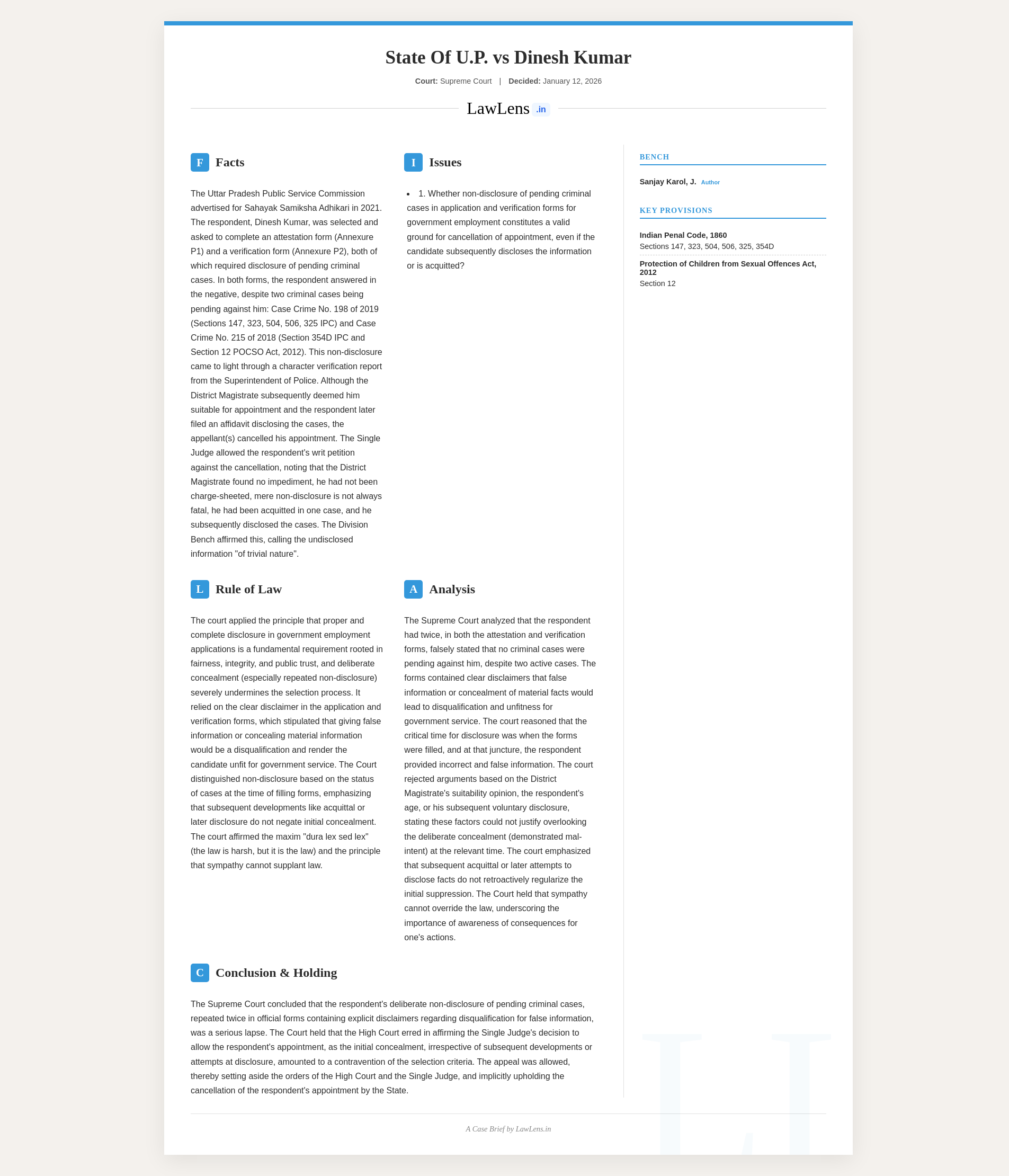 State of U.P. v. Dinesh Kumar; 2026 INSC 49 - Public Employment- Non Disclosure - Criminal Cases