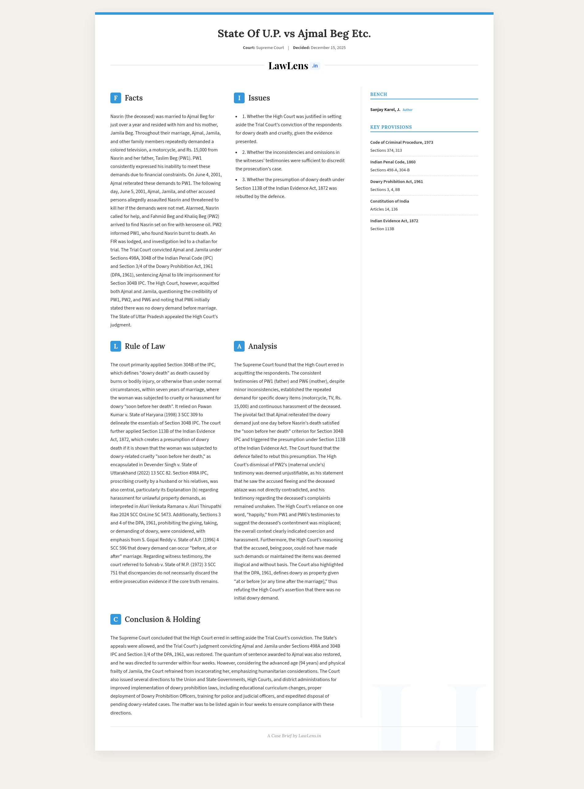 State of U.P. v. Ajmal Beg 2025 INSC 1435 - Dowry Prohibition Act