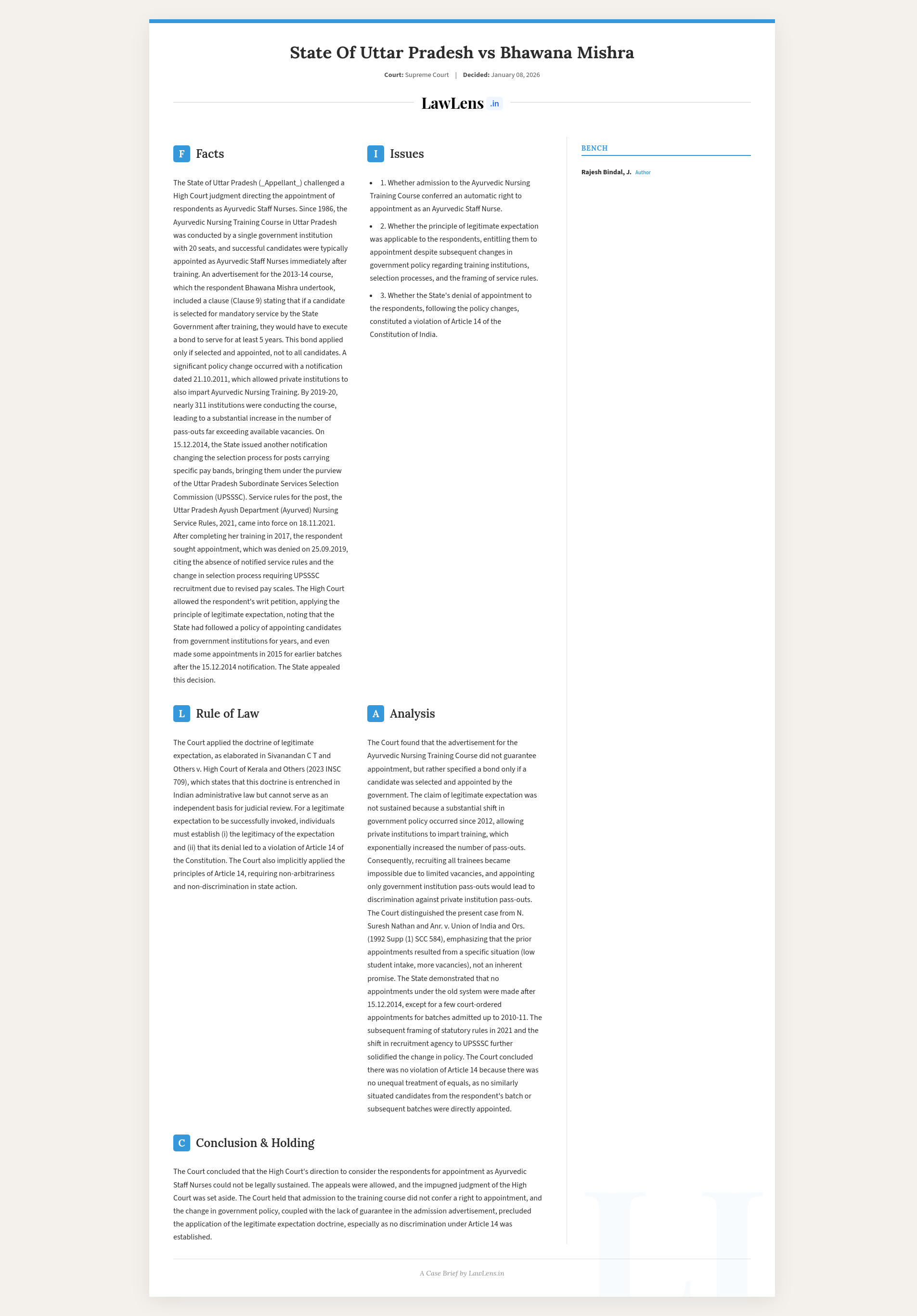 Factual Summary: Supreme Court set aside Allahabad High Court orders that had directed Uttar Pradesh to appoint Ayurvedic Staff Nurse trainees, holding that mere admission and completion of training did not confer a right to appointment. It found that post-2011 policy changes allowing private institutions and the 2014 shift to UPSSSC recruitment, followed by 2021 service rules, required a competitive selection process, making the doctrine of legitimate expectation inapplicable.