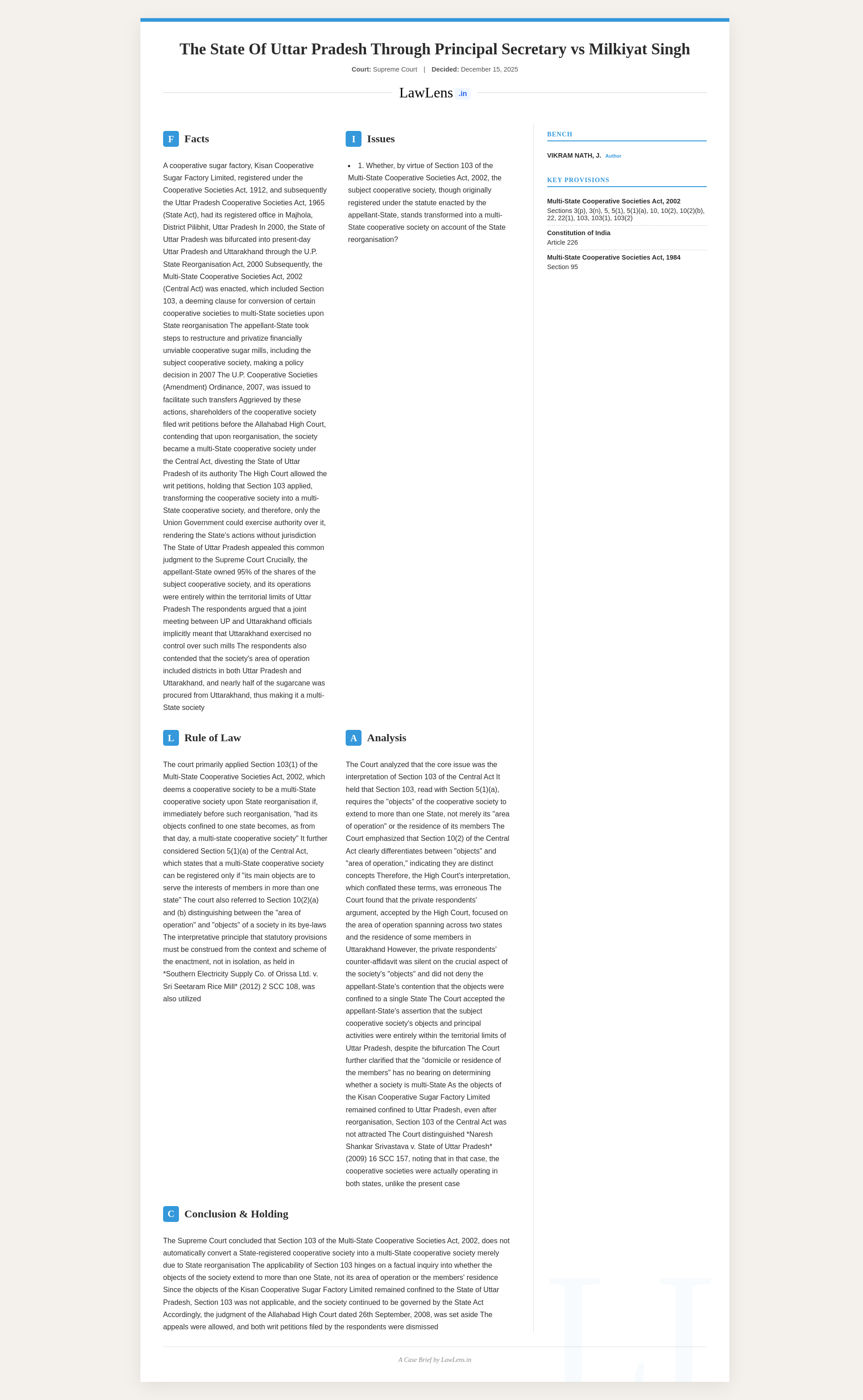 State of Uttar Pradesh v. Milkiyat Singh 2025 INSC 1427 -Multi-State Cooperative Societies Act