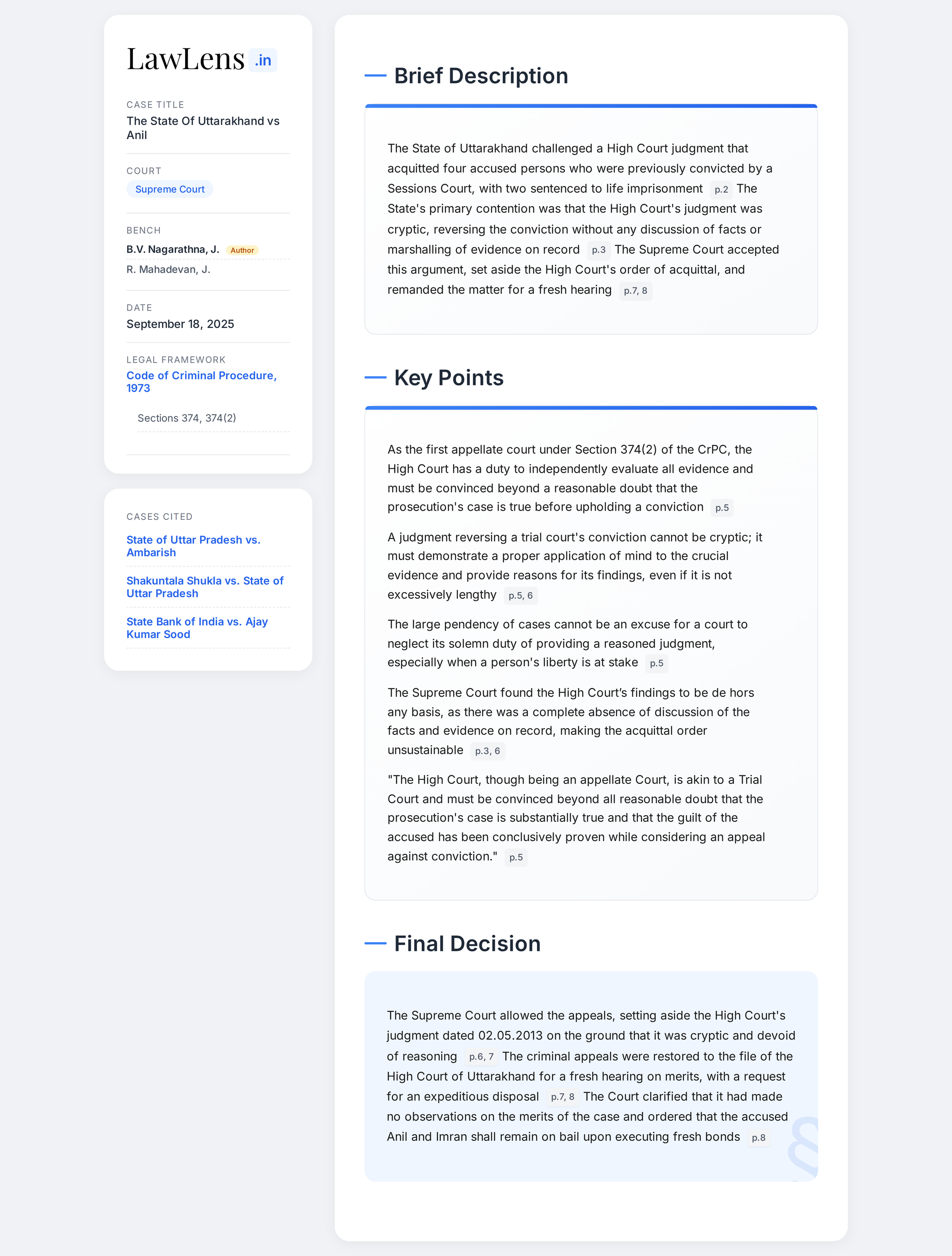 Code of Criminal Procedure 1973 -Section 374(2) -As the first appellate court, the High Court is expected to evaluate the evidence including the medical evidence, statement of the victim, statements of the witnesses and the defence version with due care. While the judgment need not be excessively lengthy, it must reflect a proper application of mind to crucial evidence. Albeit the High Court does not have the advantage to examine the witnesses directly, the High Court should, as an appellate Court, re-assess the facts, evidence on record and findings to arrive at a just conclusion in deciding whether the Trial Court was justified in convicting the accused or not -Large pendency of cases cannot come in the way of the Court’s solemn duty, particularly, when a person's liberty is at stake. (Para 8-10)
