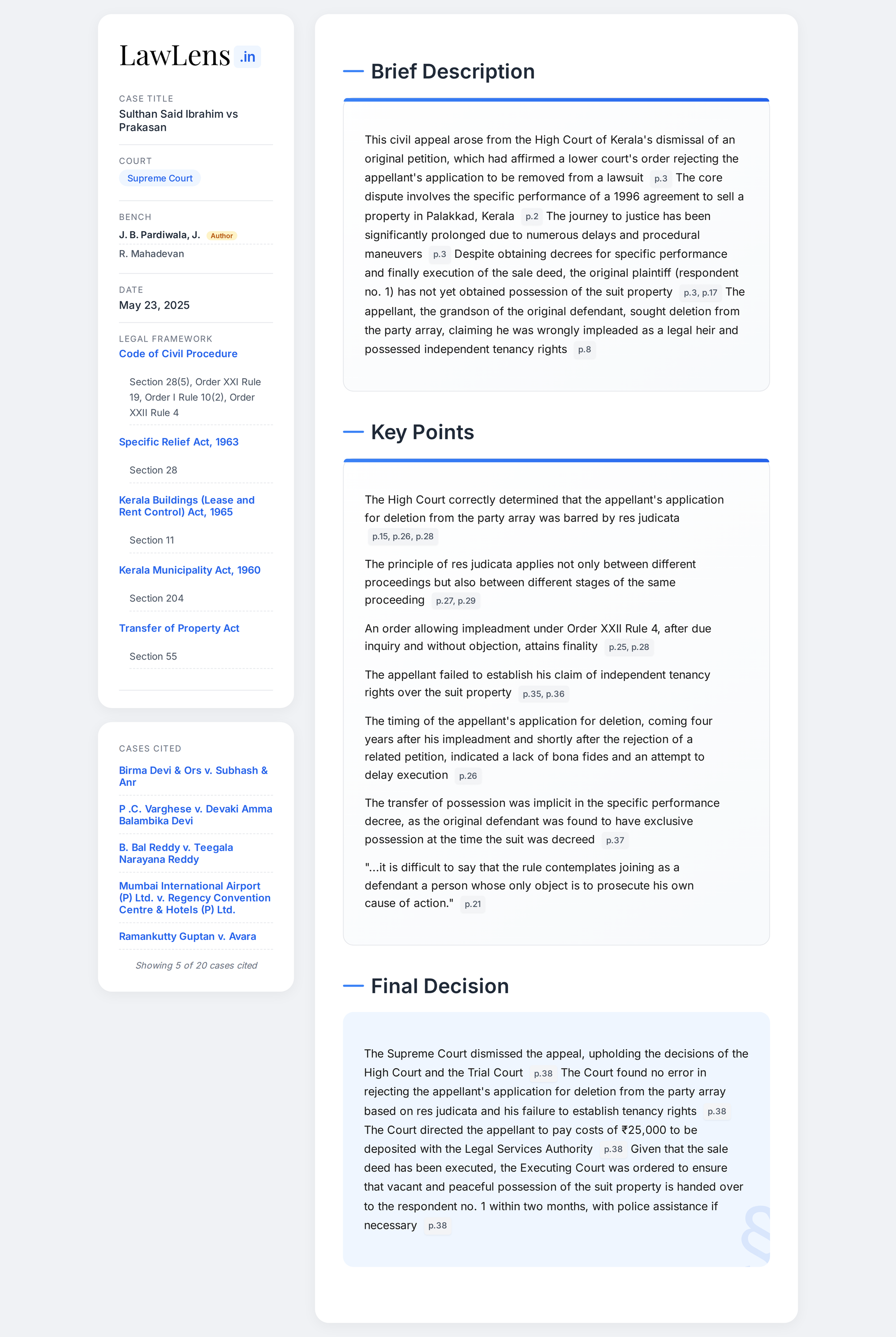 Sulthan Said Ibrahim vs Prakasan 2025 INSC 764 - Res Judicata - Order I Rule 10, Order XXII Rule 4 CPC - Specific Relief Act