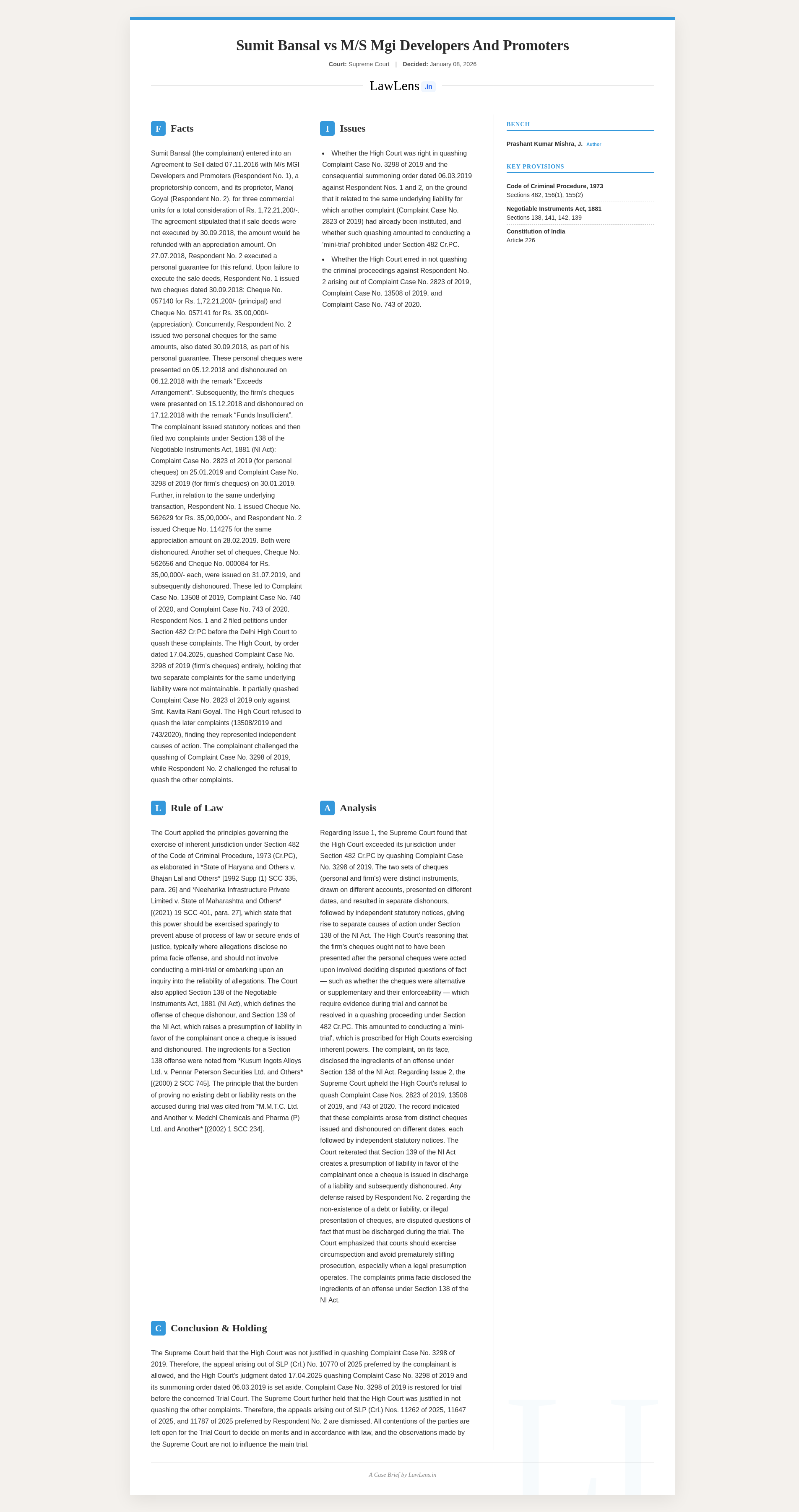 Summary: The Supreme Court addressed multiple Section 138 NI Act complaints arising from dishonoured cheques linked to a 2016 Agreement to Sell, where MGI Developers failed to execute sale deeds and issued both firm and personal cheques that were later returned unpaid. It held that each dishonour created a distinct cause of action, set aside the High Court’s quashing of Complaint Case No. 3298/2019, and allowed that case to proceed, while upholding the refusal to quash Complaint Case Nos. 2823/2019, 13508/2019, and 743/2020. The Court emphasized that disputed factual issues and the statutory presumption under Section 139 must be tested at trial, leaving all contentions open.