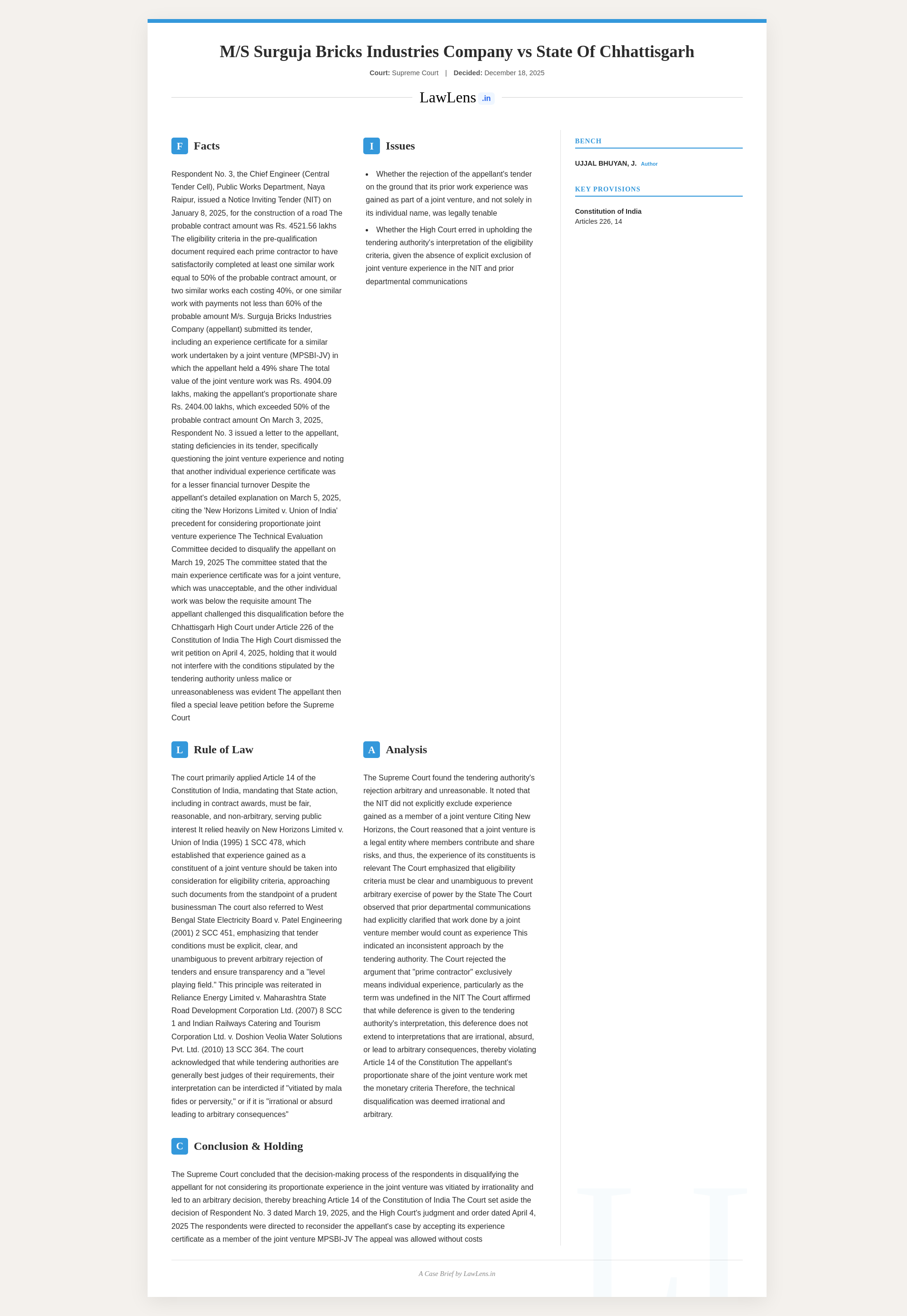 Surguja Bricks Industries Co. v. State of Chhattisgarh, 2025 INSC 1456 - Judicial Review - Tender Matters