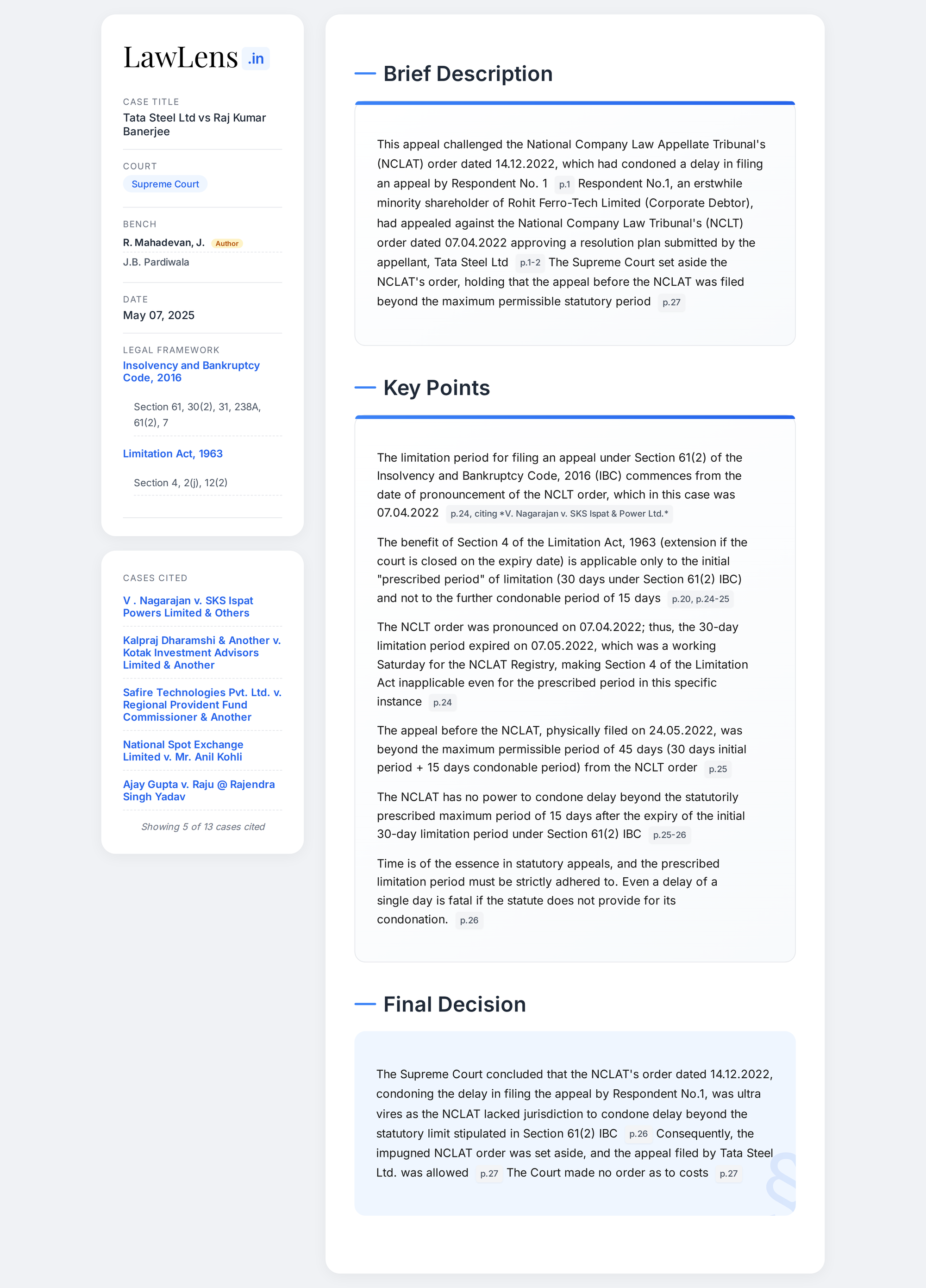 Tata Steel Ltd. vs Raj Kumar Banerjee 2025 INSC 639 - NCLAT - S. 61 IBC - S.4 Limitation Act