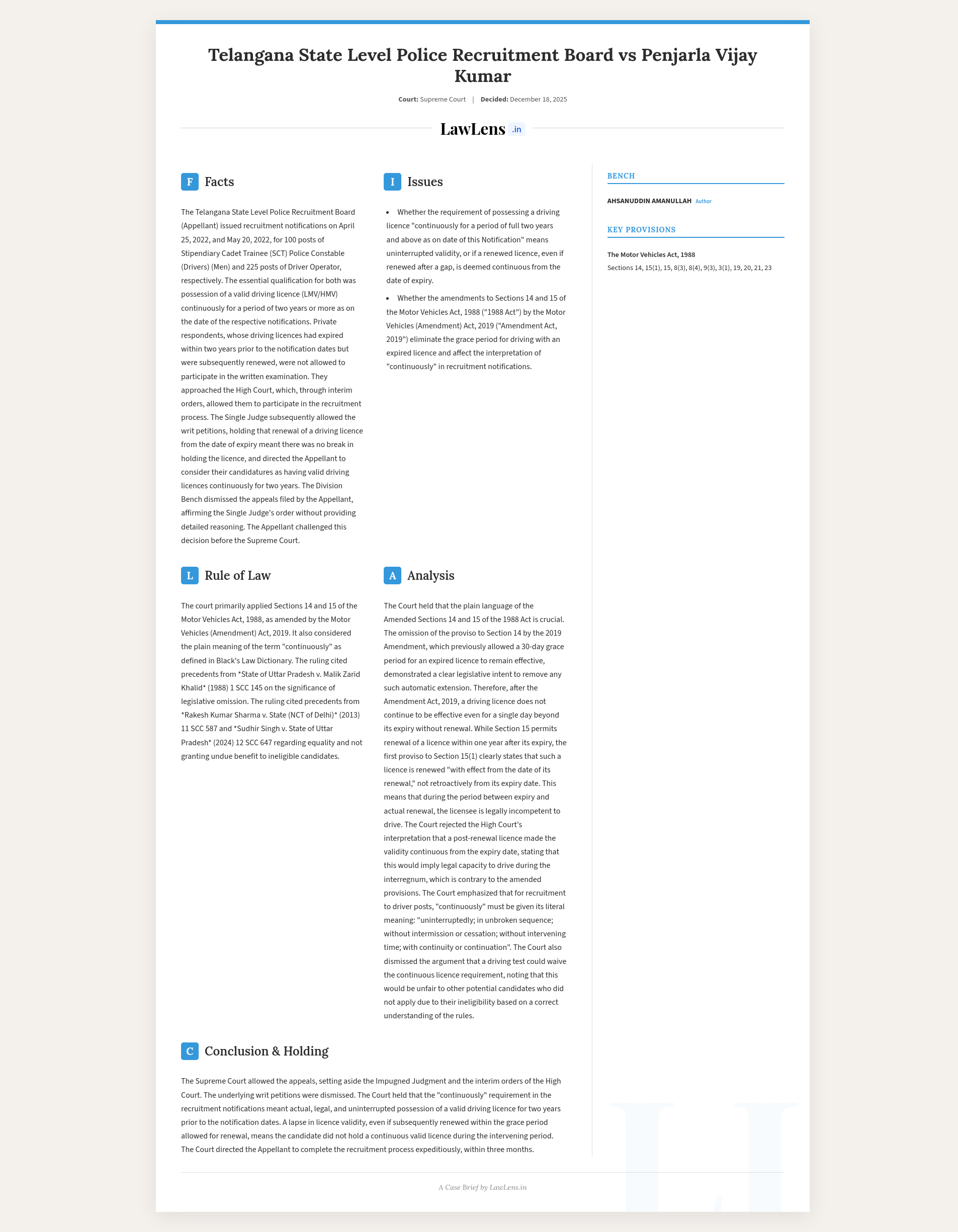 Telangana State Level Police Recruitment Board v. Penjarla Vijay Kumar 2025 INSC 1452 - S.14 Motor Vehicles Act - Expiry Of Driving Licence