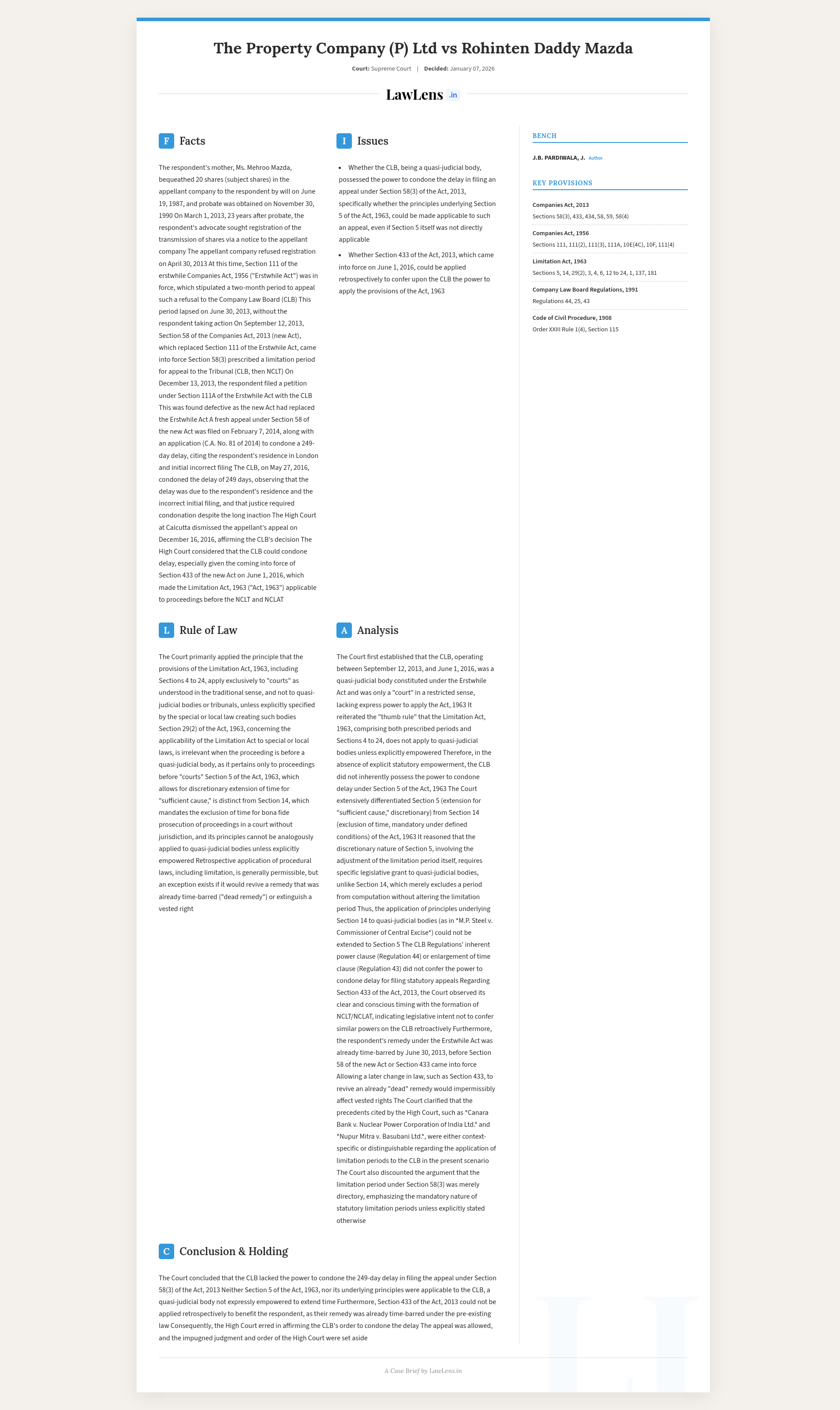 The Property Company (P) Ltd. v. Rohinten Daddy Mazda; 2026 INSC 33 - Companies Act - CLB - S.5 Limitation Act - Delay Condonation Power