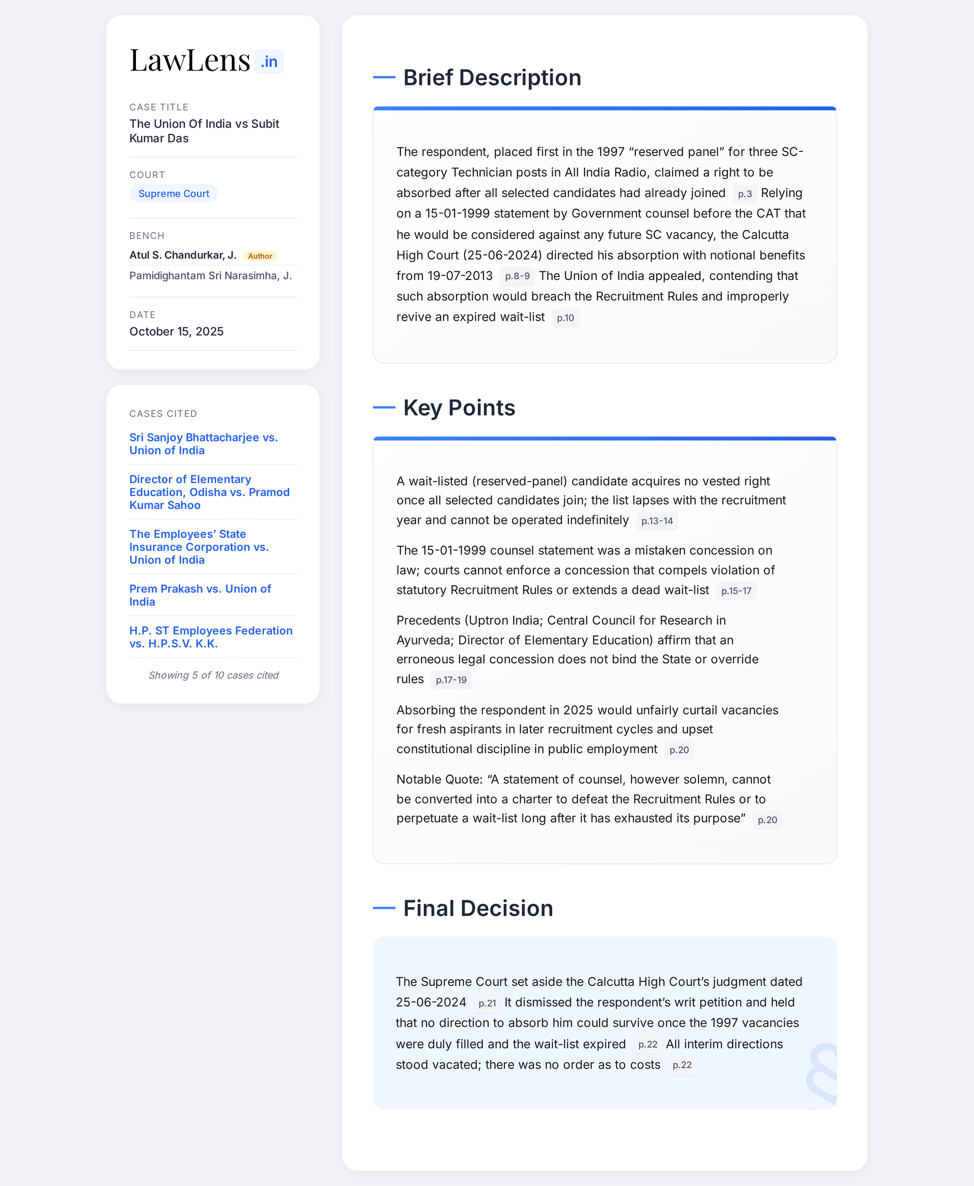 Union of India vs Subit Kumar Das 2025 INSC 1235 - Wait List - Concession Made By Counsel On Question Of Law