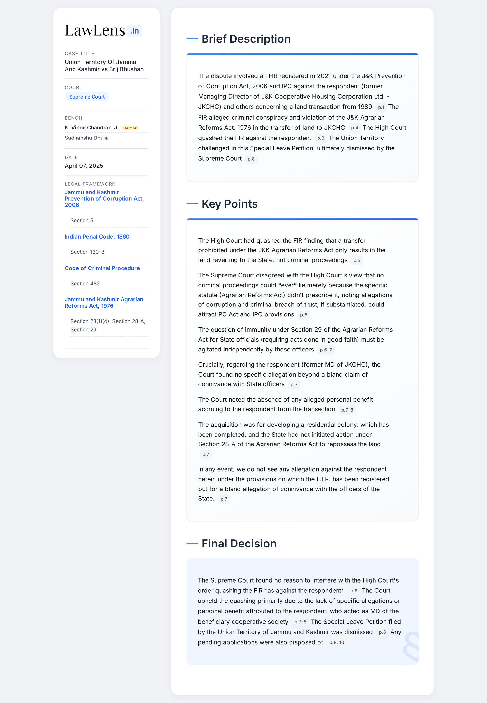 Union Territory Of Jammu And Kashmir vs Brij Bhushan 2025 INSC 461 - FIR Quashing Upheld