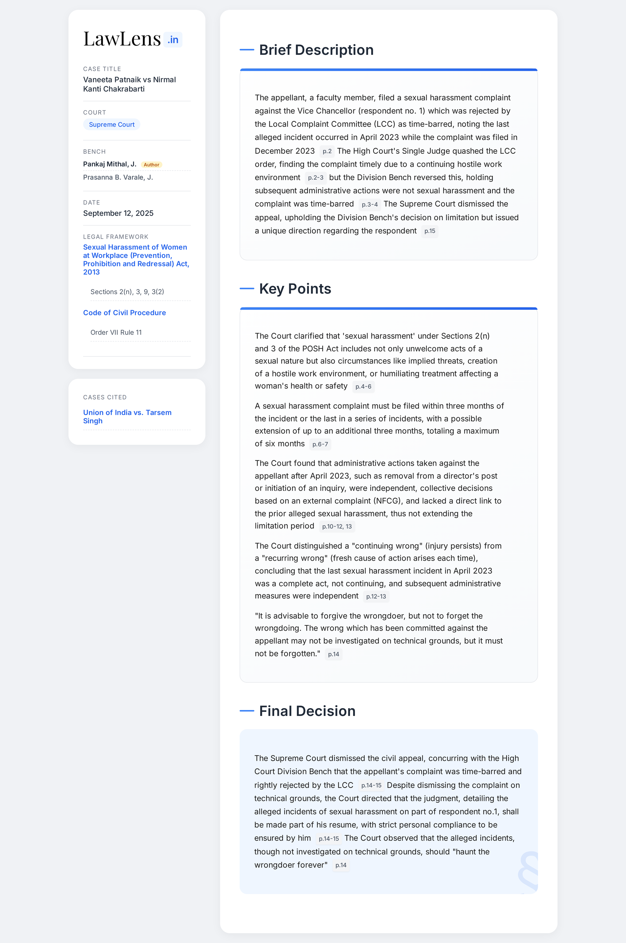 Vaneeta Patnaik v. Nirmal Kanti Chakrabarti 2025 INSC 1106 - POSH Act - Limitation