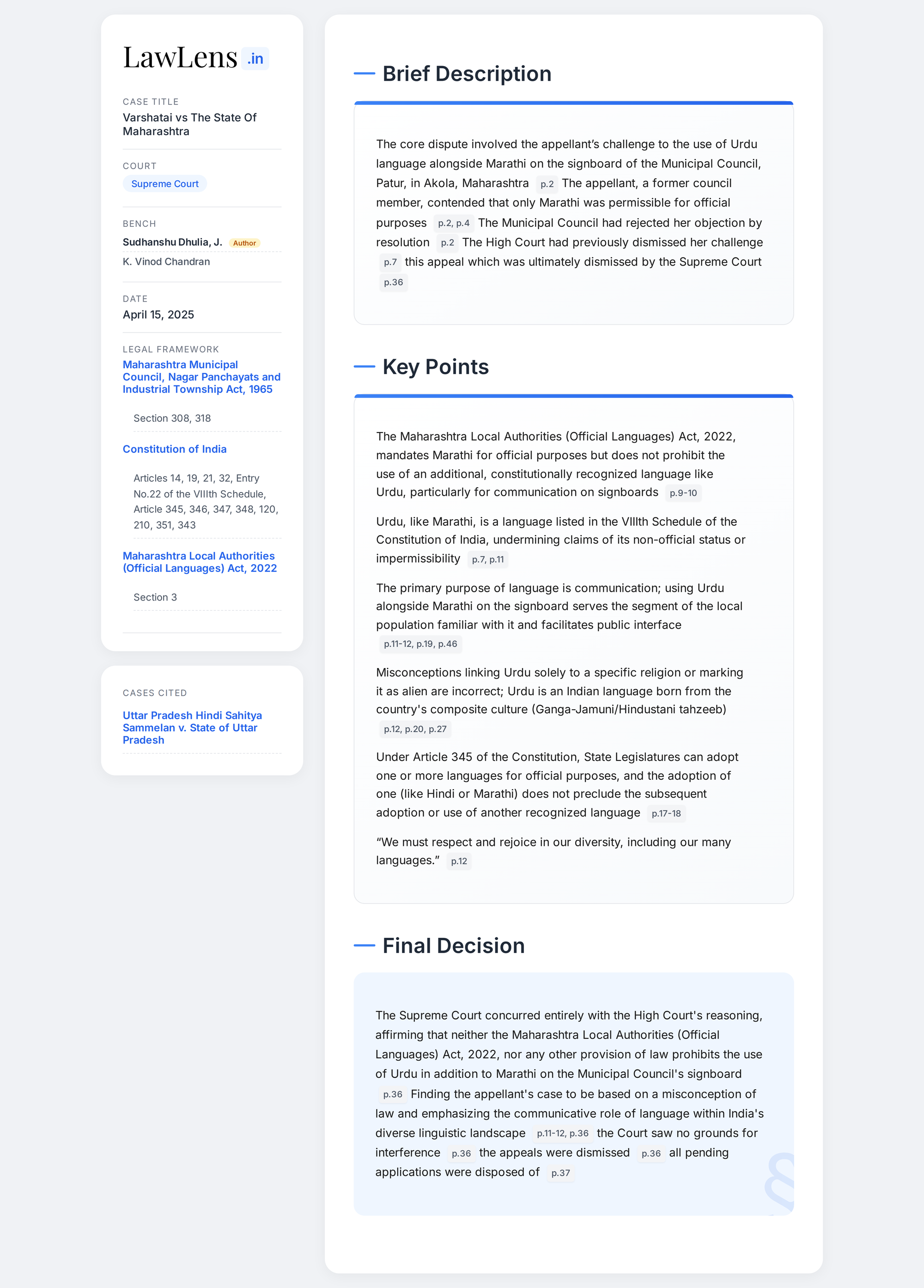 Constitution of India - Schedule VIII - Maharashtra Local Authorities (Official Languages) Act, 2022 - There is no prohibition on the use of Urdu under the 2022 Act or in any provision of law- If people or a group of people, residing within the area covered by the Municipal Council are familiar with Urdu, then there should not be any objection if Urdu is used in addition to the official language i.e. Marathi, at least on the signboard of the Municipal Council. Language is a medium for exchange of ideas that brings people holding diverse views and beliefs closer and it should not become a cause of their division. (Para 46) - The use of language for official purposes is not according to any rigid formula. (Para 40) - Marathi and Urdu occupy the same position under Schedule VIII of the Constitution of India (Para 15)