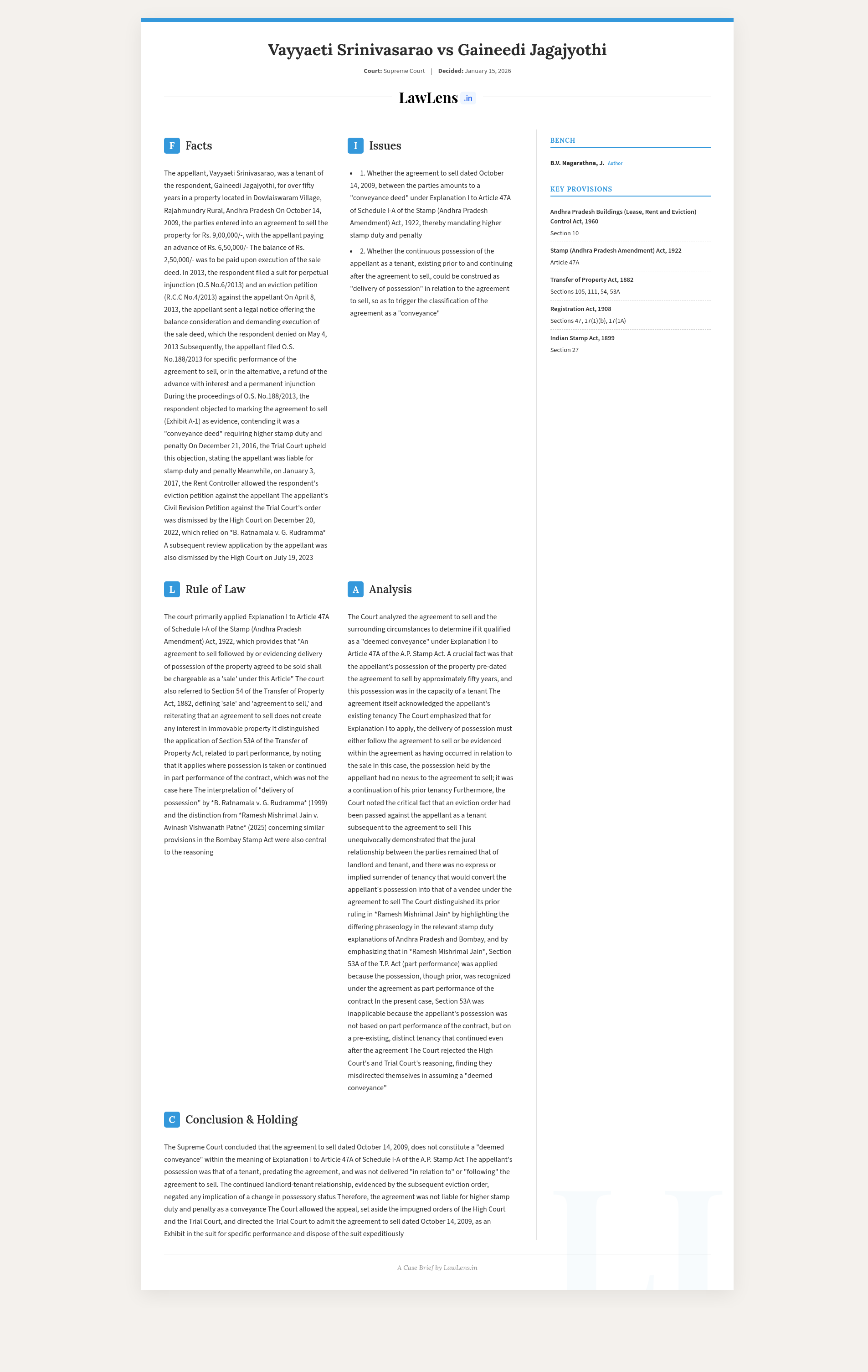 Vayyaeti Srinivasarao v. Gaineedi Jagajyothi; 2026 INSC 59 - Transfer of Property Act - Stamp Act