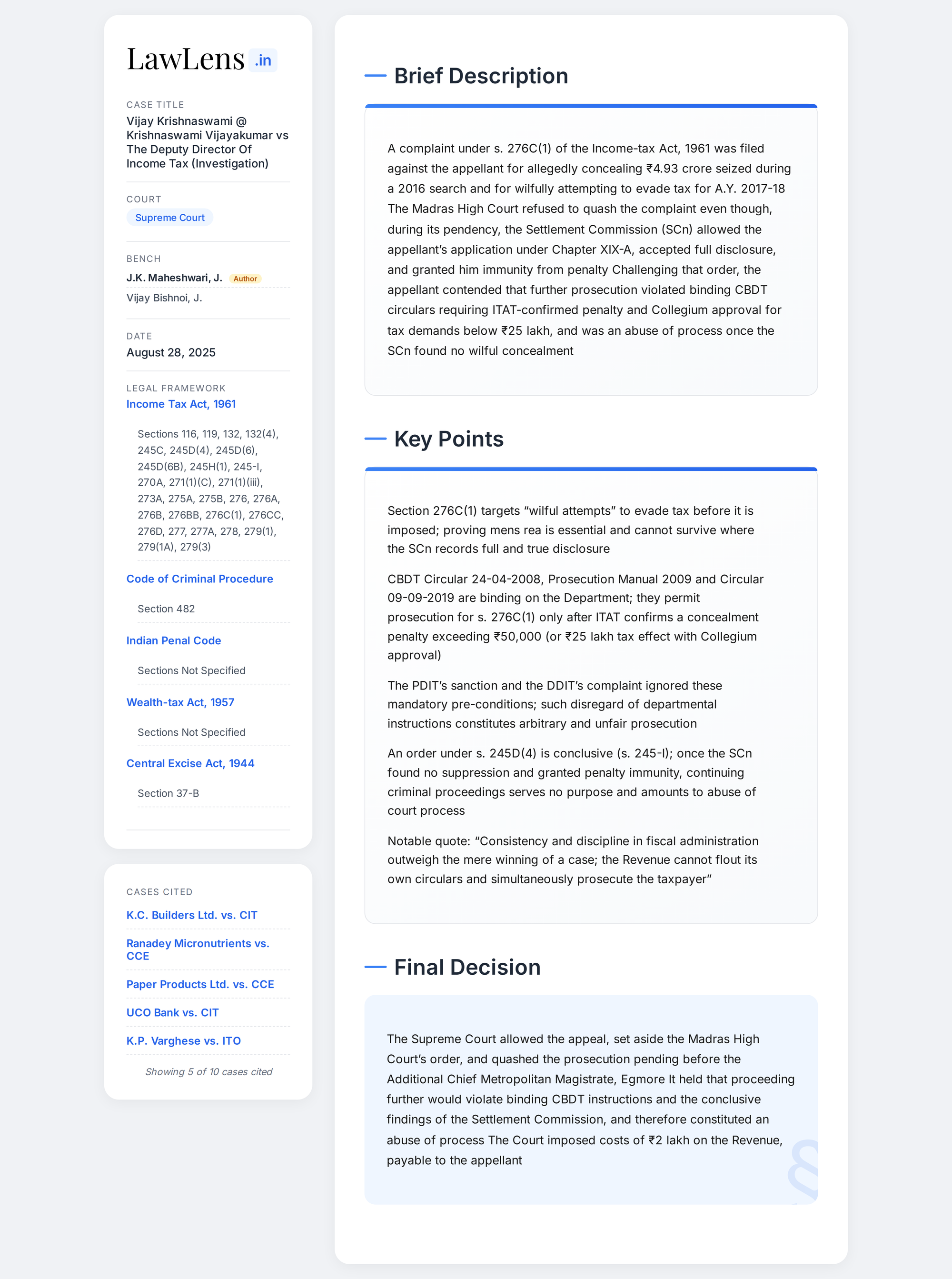 The case is Vijay Krishnaswami v. Deputy Director of Income Tax (Investigation), neutral citation: 2025 INSC 1048.
