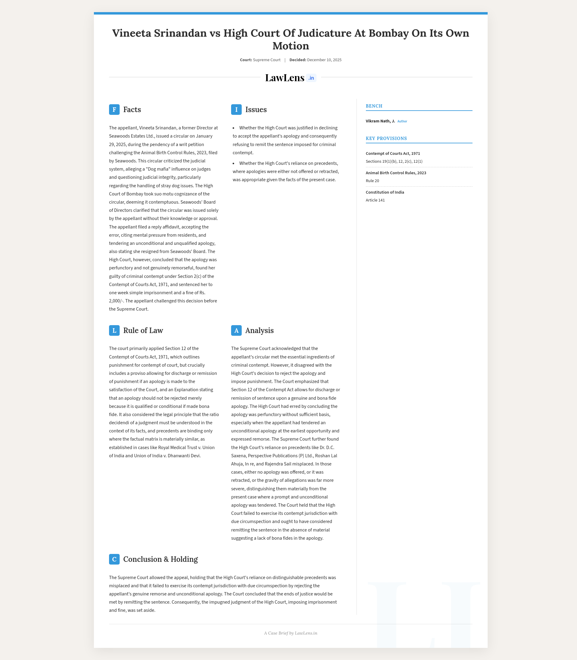 Vineeta Srinandan vs High Court Of Judicature At Bombay ; 2025 INSC 1408 - Contempt of Courts - Ratio Decidendi