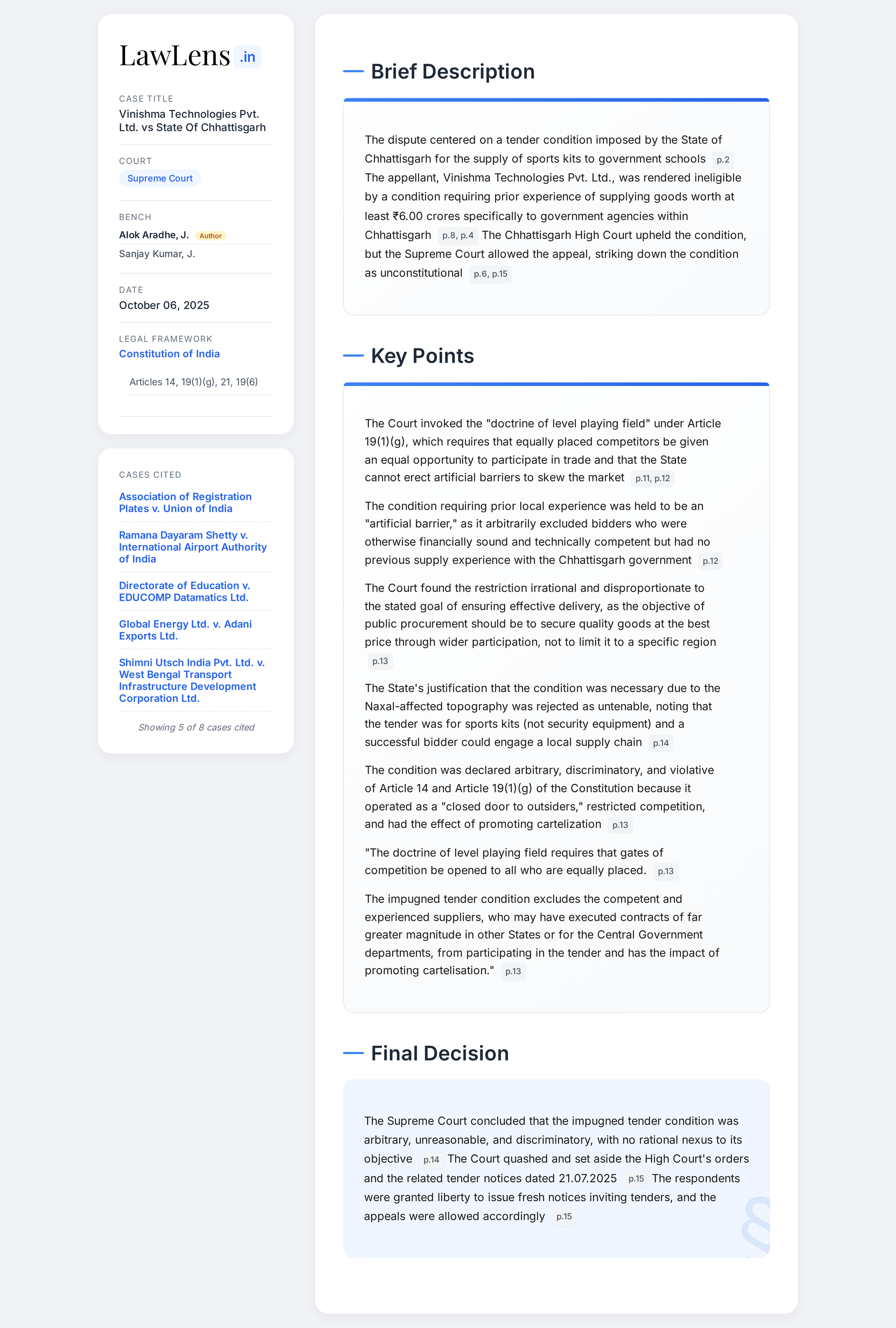 Vinishma Technologies Pvt. Ltd. v. State of Chhattisgarh 2025 INSC 1182 - Art 14,19,21 Constitution - Doctrine of Level Playing Field - Tender