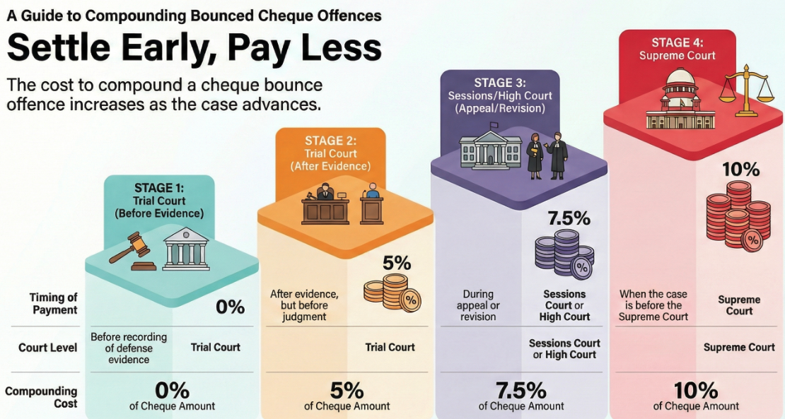 Negotiable Instruments Act - Section 138 - The offence under Section 138 of the NI Act is quasi-criminal in nature and is explicitly made compoundable under Section 147 of the Act. The legislative intent is to ensure the payment of money and promote the credibility of cheques- Referred to modified guidelines of compounding from Sanjabij Tari v. Kishore S. Borcar : (a) If the accused pays the cheque amount before recording of his evidence (namely defence evidence), then the Trial Court may allow compounding of the offence without imposing any cost or penalty on the accused. (b) If the accused makes the payment of the cheque amount post the recording of his evidence but prior to the pronouncement of judgment by the Trial Court, the Magistrate may allow compounding of the offence on payment of additional 5% of the cheque amount with the Legal Services Authority or such other Authority as the Court deems fit. (c) Similarly, if the payment of cheque amount is made before the Sessions Court or a High Court in Revision or Appeal, such Court may compound the offence on the condition that the accused pays 7.5% of the cheque amount by way of costs. (d) Finally, if the cheque amount is tendered before this Court, the figure would increase to 10% of the cheque amount. (Para 16-17)