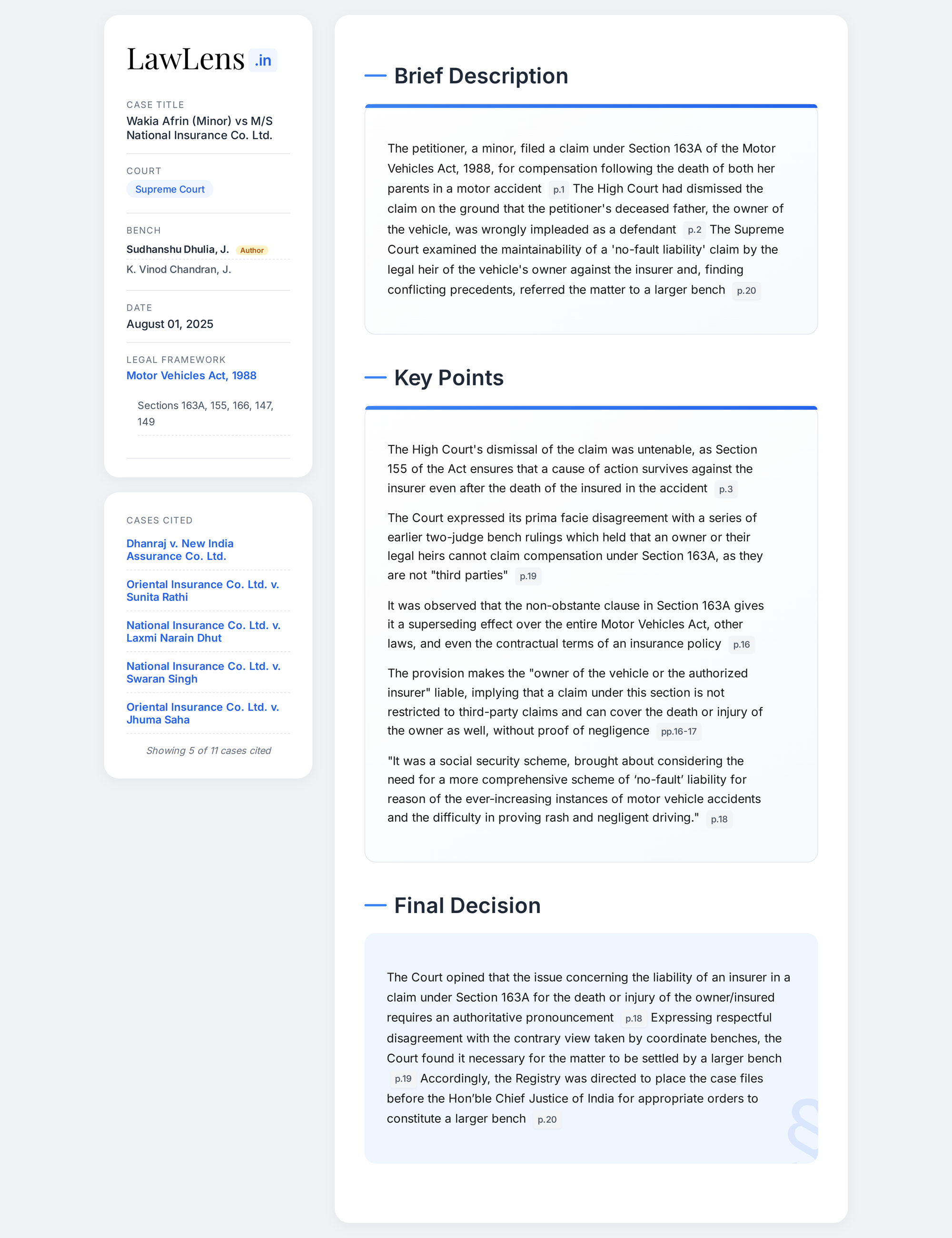 Wakia Afrin (Minor) vs National Insurance Co. Ltd. 2025 INSC 919 - Insurer's Liability U/S.163A MV Act - Referred To Larger Bench