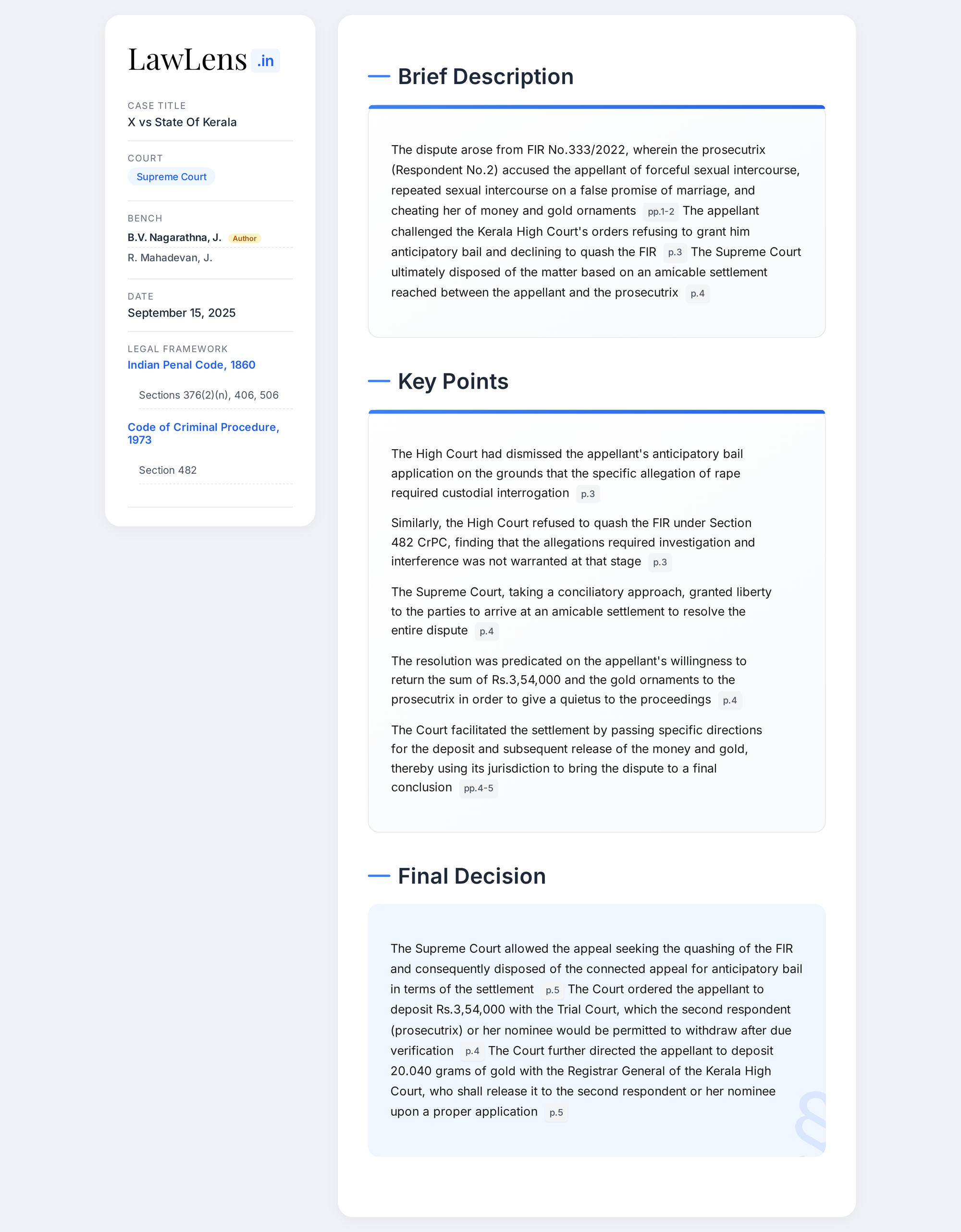 - Procedural history: SLP (Crl.) Nos. 17845/2024 and 18408/2024; arising from Kerala High Court orders dated 06.07.2022 (anticipatory bail rejected) and 08.11.2024 (FIR quash rejected).