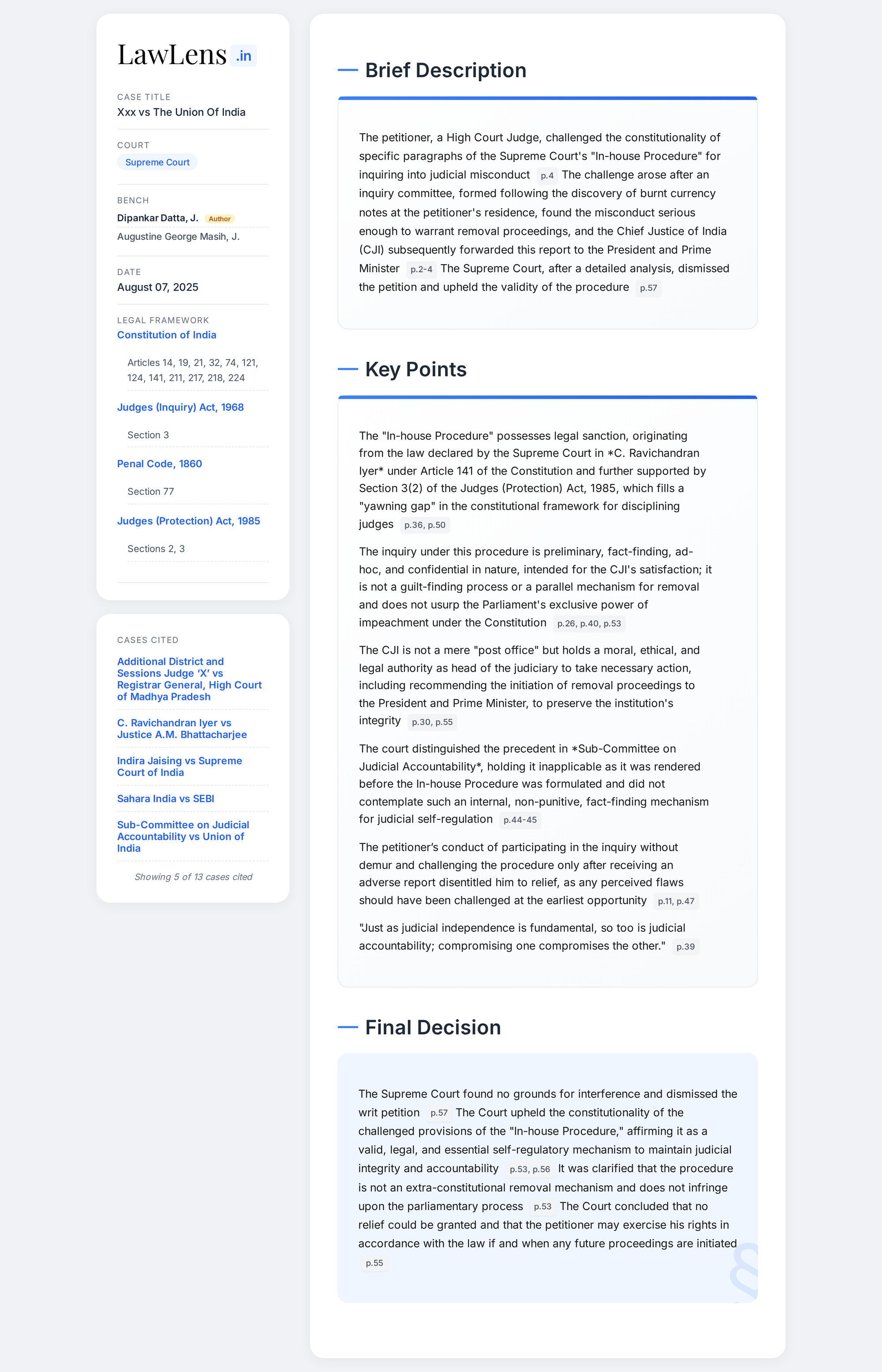 Constitution of India - Article 124,141, 217,218 ; In-house Procedure- (Para 114) The PROCEDURE acts as a check on Judges’ unbridled freedom of action and thereby seeks to prevent outcomes that could be harmful or unjust - not all misbehaviour of Judges necessarily rise to the level of "proved misbehaviour" attracting Articles 217 and 218 read with clauses (4) and (5) of Article 124. The Constitution’s silence on cases that do not rise to the level of proven misbehaviour creates a significant structural vulnerability, which has since been addressed by the PROCEDURE (Para 85) CJI is not a mere post office between the COMMITTEE and the President/the Prime Minister that the REPORT is to be forwarded without any remarks/recommendation. The CJI is clearly an important person, if not the most, in the larger scheme of maintaining institutional interest and credibility to ascertain whether a Judge has indulged in misconduct. As per the PROCEDURE, after receiving a complaint against a Judge or a report from the Chief Justice of the High Court of which he is a Judge, the CJI has to apply his mind to the nature of complaint/report together with supporting materials, if any. If the CJI believes that the matter requires a deeper probe, he is required to constitute a Committee for an in-house inquiry. The report of inquiry may, or may not, find the allegations against the Judge to be serious, so as to call for any measure. However, if it does, the CJI is under an obligation to forward the report to the President and the Prime Minister. We see no justification to hold that in so forwarding, the CJI may not give his own views. (Para 64)